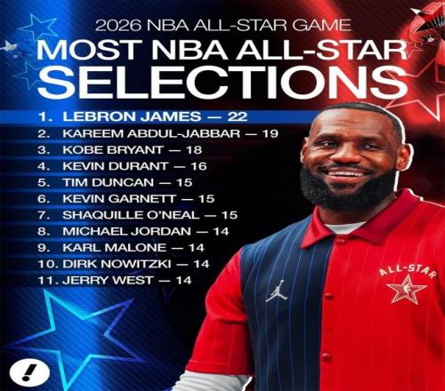 入选全明星总次数:詹姆斯22次扩大优势,贾巴尔科比分列二三