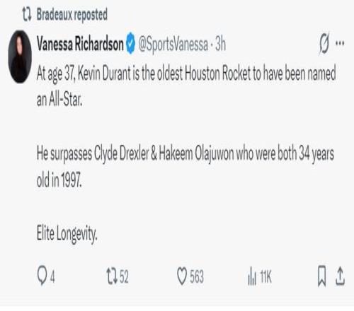 根据火箭记者Vanessa Richardson的报道,37岁的杜兰特成为火箭队史最年轻的全明星球员,他超越了德雷克斯勒、奥拉朱旺(34岁),这两人在1997年入选了全明星。换言之杜兰特是火箭队1967年建队59年最年轻的全明星球员,评语:精英级的巅峰期。